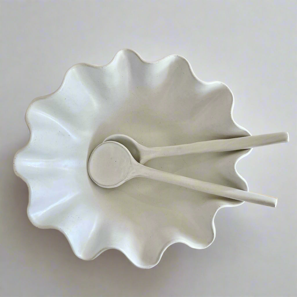 With a contemporary look, these long stem spoons have been paired with the White Rippled Serving Bowl and the Large Wave Bowl in the product photography. The serving spoons are glazed with a beautiful Avoca white glaze.
